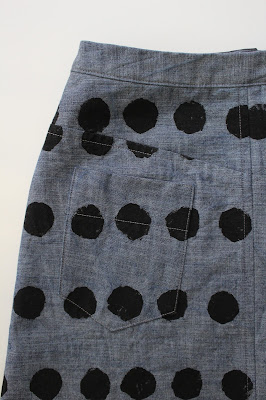 I am on a printing frenzy over here and was planning on the black spots, but they looked like they would be a bit lost on the darker right side of the denim, so when the bright idea to print the wrong side instead struck I was pretty excited. The denim was pre-washed and has gone a little streaky from the blue dye, but it kind of adds to the effect. I love how this turned out so much!