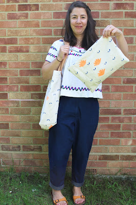 Next up is this tote and knitting project bag made from some hand printed natural denim. It was an experiment on a scrap of fabric that I wanted to use somehow, but was finally inspired a couple of weeks ago. No pattern for either, but basically just rectangles wrangled into bags. The leather handles and screw in rivets were all from Merchant and Mills.