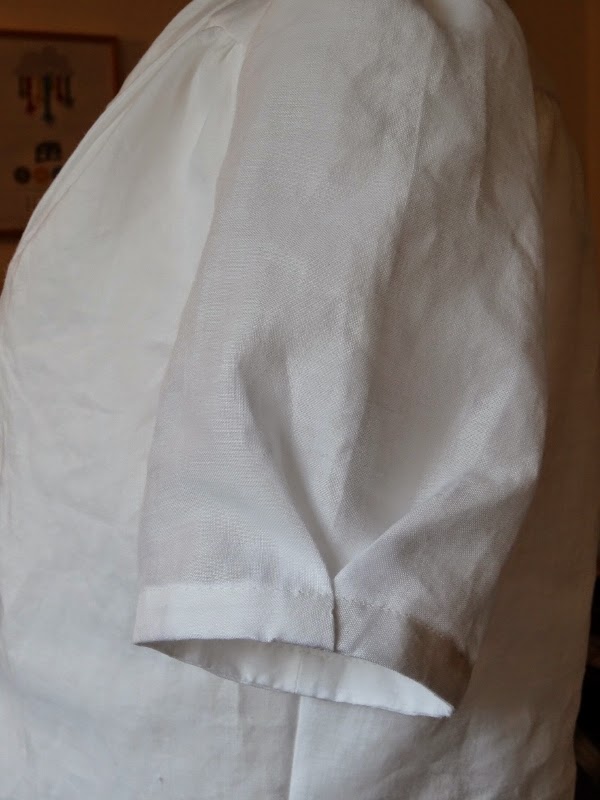 I did not refer to the instructions for this, which is pretty standard for me, but instead ploughed on ahead as I would for anything made from denim. I drafted some pockets which are cut rather square and basically topstitched everything I could. I actually bought matching thread (something I NEVER do), so wanted to use as much of it as possible. The side seams are lap and fell whilst the back seam is plain and raw edges are bound with some bias strips. The binding and pockets are cut from a work shirt of my husbands which came out of the wash this week with a hole in the sleeve. I can't pretend I was too unhappy to relieve him of it!